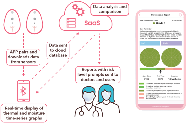 Our IBC-bestmammo “Breast Biological Rhythm monitoring system” uses a pair of sensor devices to collect the temperature and humidity of the left and right breast surfaces and transmits the data to SaaS through mobile phone software (APP or Applets) for big data analysis. You can access the Breast Health Risk Report on your mobile phone.