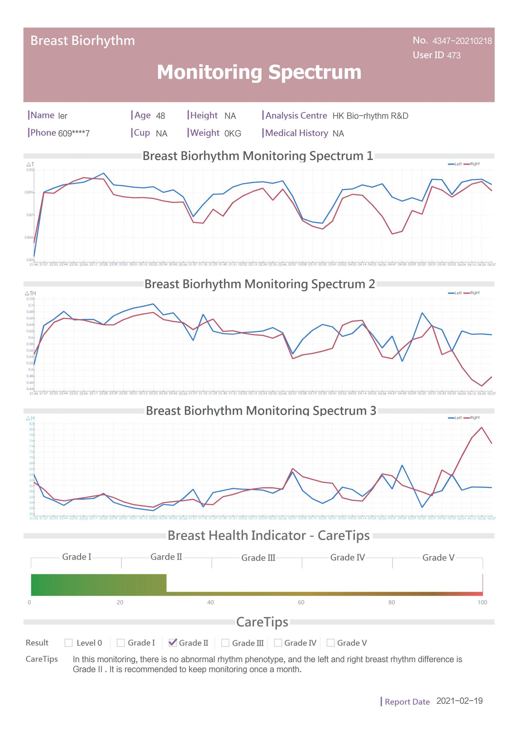 Your breast health status will be displaced by a continuous health levels diagram and the associated risk will be expressed in grades, i.e., from Grade 1 (healthy breasts) to Grade 5 (indicating high risk of breast health). The system will also give corresponding suggestions based on your health risk gradings and gives recommendations to seek further medical diagnosis as necessary.